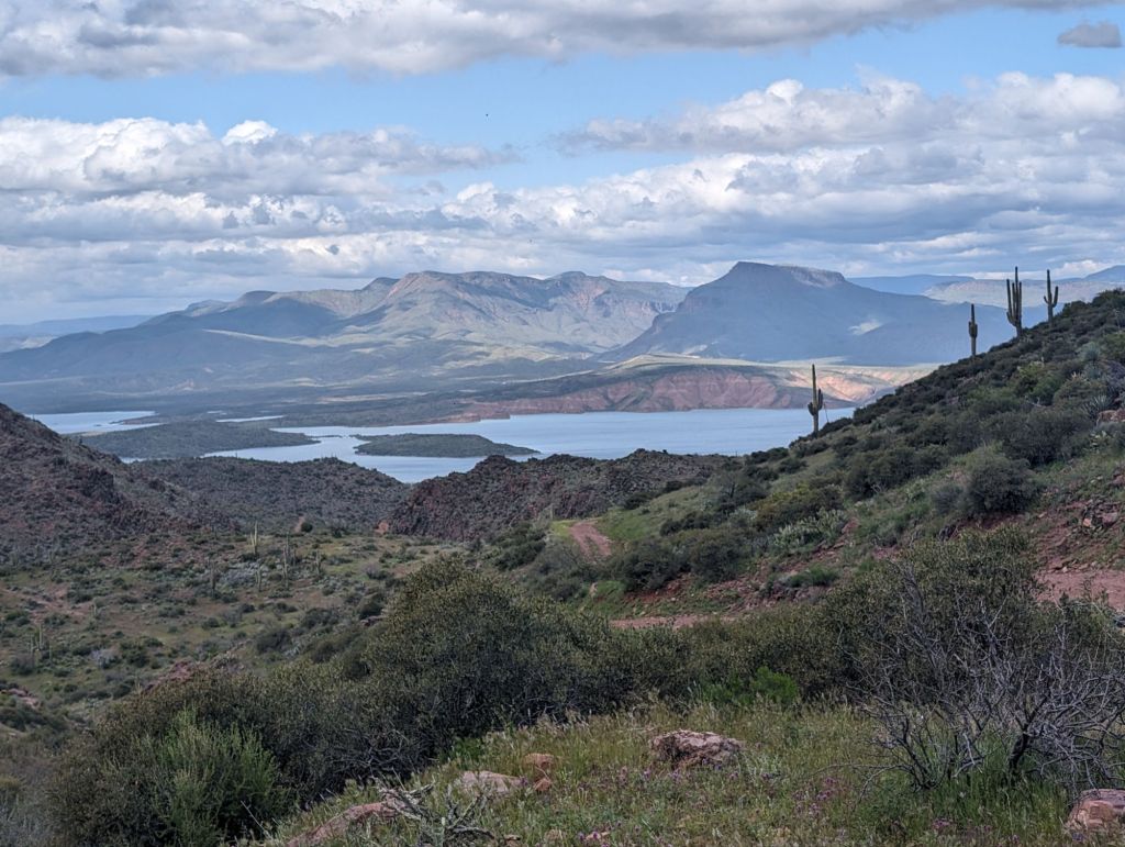 After I was back on the trail it crossed several water sources as it ascended to Reavis Ranch. There were so many steep climbs today. At one point the trail dropped 800 feet straight down, crossed a stream and went 800 feet straight back up onto an incredibly windy ridge. It felt like my pack was going to help me blow over; the wind was so strong I was getting knocked off balance. After all the difficult climbing, the trail got on a very rocky dirt road. I fell down quite a few times on my way into Roosevelt. When I first saw the lake I was absolutely blown away that something like that could exist in Arizona. It is a human made lake via a dam and it provides water for the Phoenix area. It was so pretty. I thought the coolest part about it was that it is almost completely surrounded by the Tonto national forest so there is practically no development on it or very many boats on the lake at all. I successfully arrived at the Roosevelt Marina before the storm blew in. I stopped in at the store and picked up my box for $10. My family shipped me a classically great resupply mostly consisting of protein pucks, protein powder, my favorite snacks, and two backpacking meals for dinner. They know what I have consistently eaten on every trail over the years. It was the first box I received on the trail and I was so looking forward to it. Shipping a box there was a smart move as the only resupply option was the expensive marina store that was basically a gas station. I really appreciate having more substance to my diet than snickers bars. At the marina was a “hiker shed” with a massive hiker box, a place to charge things, and a picnic table with a few hikers hanging around. A man named “Merlin” was doing trail magic. I drank a PBR and absolutely destroyed a plate of homemade cookies that he made in his Van. I had such a weird craving for a homemade warm chocolate chip cookie yesterday and this trail magic provided exactly what I was wanting. I got a fish sandwich to go from the marina restaurant and Scott picked me up to go stay at his and Becky’s beautiful oasis of a house that they call “Rosie’s Place” after their rescue dog that lives there. Scott and Becky are two registered trail angels that live in Tonto basin and help hikers out with a place to stay, rides, and water caching. I had such a relaxing night getting clean and staying with them. I was warm, cozy, out of the storm and excited to sleep as the lack of no sleep lately has really been starting to impact me.
