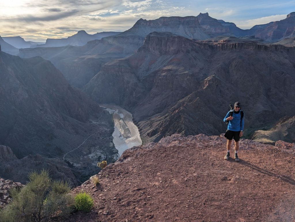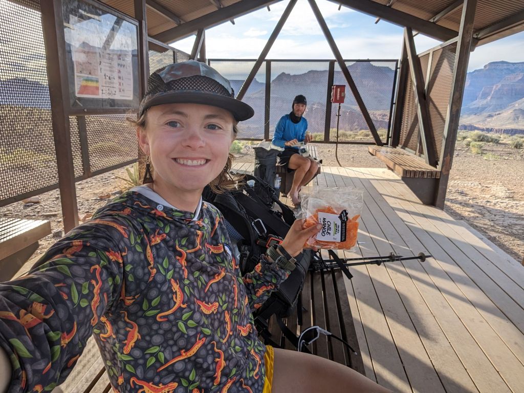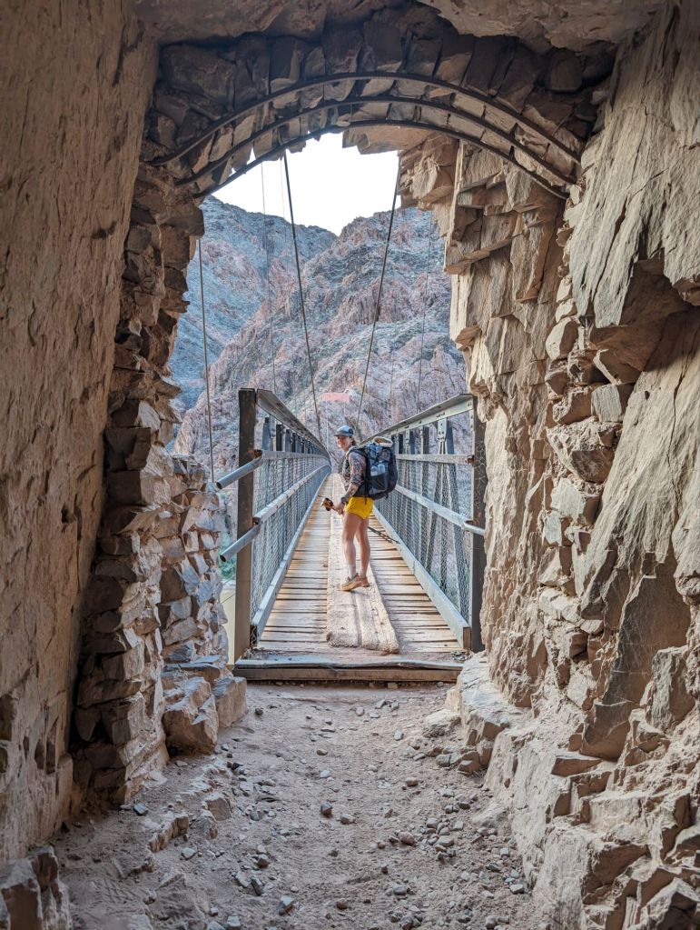 I got back on the shuttle bus to the campground and began all my chores. I packed up my backpack and walked to the camper services building to take a shower and do my laundry. It was here that I met up with Martin again who also booked a permit for the bottom of the Grand Canyon tonight. We decided to hike down together starting at 2pm. Before leaving the South Rim I got lunch with Martin and two other hikers at the Deli. With an ice cream cone to go Martin and I started walking along the south rim to the south kaibab trailhead. The actual AZT follows a paved bike path next to the main park entrance road but martin and I decided that the extra miles along the south rim would be worth all the views. It wasn’t until 3:30 pm that we made it to the South Kaibab Trailhead and started to hike down into the canyon after filling up on water from a spigot at the trailhead. The south kaibab was epic from the first step. The trail immediately begins to steeply descend the south rim wall via a series of switch backs tucked into an inlet of the wall. The trail was wide with big steps divided with wood or rock. The construction was impressive and epic however I needed to pay close attention to my steps as to not trip. My heavy backpack weighed on my joints as the decent continued. I took breaks every two miles just to give my knees a rest. Martin and I both took a plethora of pictures. I joked that I took more pictures on the South Kaibab trail than the entire rest of the AZT. After getting past “Oo Ahh Point” only a mile into the trail, the crowds up people we passed going back up thinned out significantly. Everytime we got one of the popular turn around points with a nice lookout and break spot the crowds would thin even more and eventually we barely saw anyone. Cedar Ridge, Skelton Point, and The Tip Off were the notable viewpointa, break locations, and turn around spots after Oo Ahh Point. On Cedar Ridge the trail literally followed a canyon ridge with drop offs on either side but the trail was incredibly wide here so it wasn’t scary like it might sound. Although the trail was descending almost 5,000 feet in 6-7 miles, there were still some flat parts here and there which made for the grade to be steep occasionally but really the trail was so well built with many switch backs it never felt too crazy like the steep trails at home that I’m used to. From the Tip Off you can get a good view of the Colorado River and both the bridges in the Canyon that cross it, they are probably less than a mile apart. The Tip Off marks the final descent to the Colorado River. Right before going over the amazing suspension bridge, the trail goes through a little tunnel. The river under the bridge was a sage green color, very wide, and looked like the current was strong and fast. We could see some hikers sitting on the beach on the Northern shore.