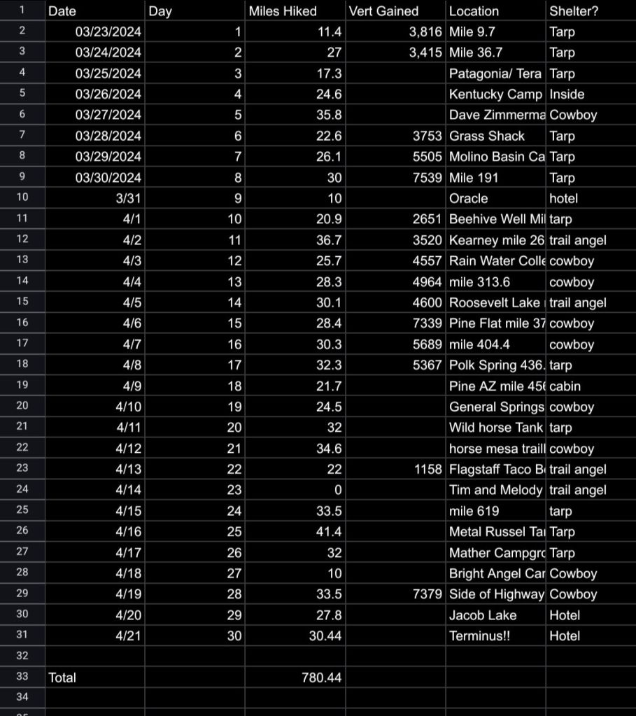 I will leave you with some brief statistics of my Arizona Trail Thru Hike.