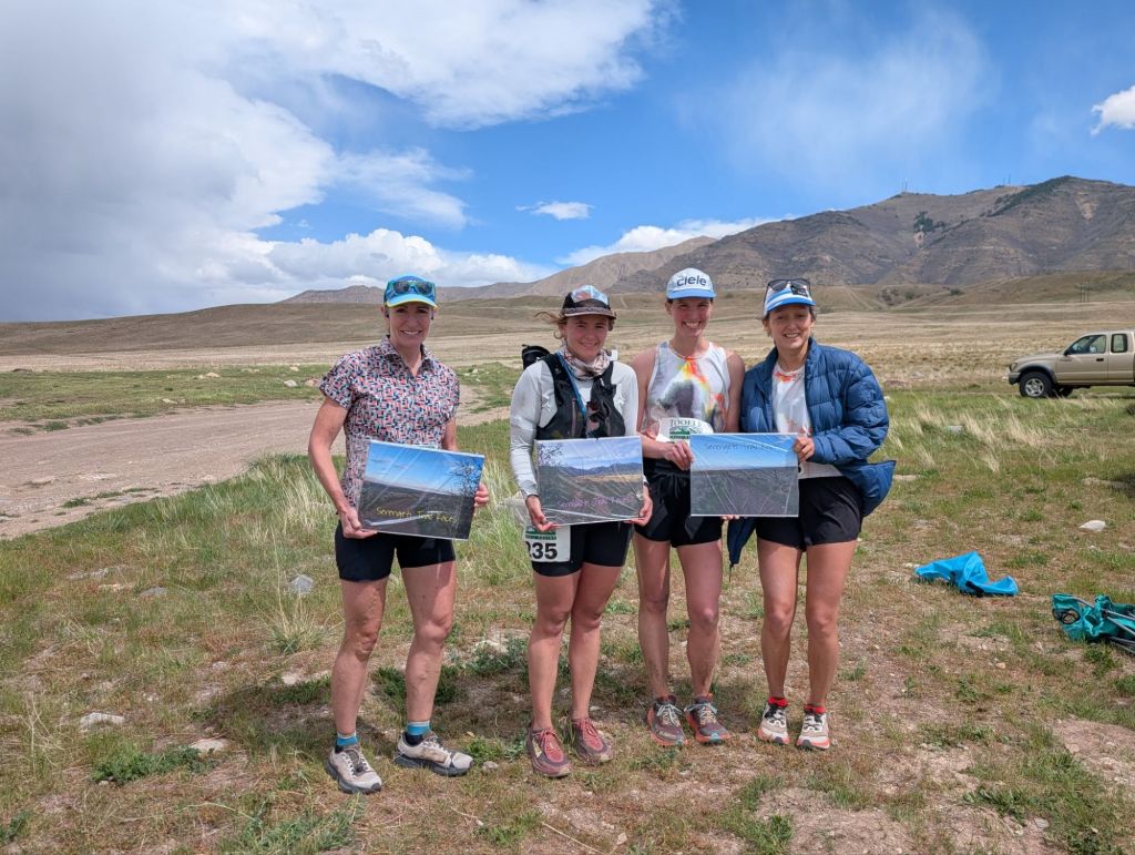 I did not let myself look behind me or even at my watch from the last aid station to the finish line. Once I knew I had five miles left (because I noted this spot on the first lap) I started to run as fast as I could. I felt so strong and was having a blast. I thought about how I finished Arches 50k in January 2025 and I could barely run the last five miles at all. I was really proud thinking about how far I have come with running in the past year and how much all of the road work I had put in the last month was paying off right now. I really hate to admit that because I hate road running … ALOT. But if it is necessary in order to get results like this then I guess I will do more of it! With three miles left to go I came up to a tall cattle gate that I could not get open. I decided to just climb over it. When I say tall I mean at least 6 feet tall. It was way over my head. During that climb I felt my right adductor cramp up so bad and I limped my first few running steps thinking “oh crap please not now”. Luckily it straightened itself out. I crossed the finish line and stopped my watch. I won! And beat my 6 hour goal by 10 minutes! I had to sit down right away because I was breathing so hard and then my legs started cramping up. I watched Joni, the second place lady, come in only a minute behind me. She told me how hard she was trying to catch me those last five miles and that she also could not get the cow gate open and climbed up behind me. 3rd place was a tie with the tank top ladies and they were only four minutes behind me maybe? We all got to pick out a fun canvas with a picture of the course on it as a prize. I picked the view of the power line road. Well that day certainly turned around!
