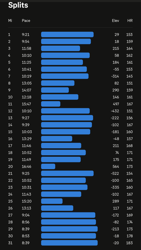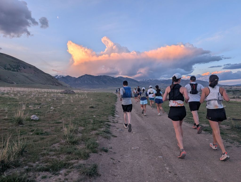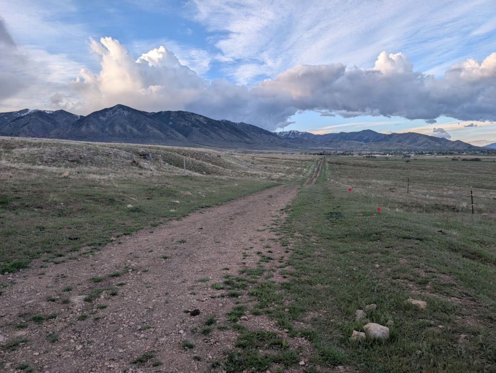 The race started at 7am. I don’t know if I even heard a gun go off. Likely it was just the race director yelling ”Go!”. About 50 or so runners took off at the same time from the spray painted line across the dirt ATV road. The course was two 25k loops but we ran the second loop in the opposite direction. Some of those runners were doing the 25k. The first 5 miles were pretty flat and stayed on an ATV dirt road through cow fields. Some cows were really close to the course and we had to go through several gates that we were instructed to make sure were closed so the cows did not get out. We ran through the valley with views of the mountains in every direction and also a view of the city of Tooele and the Great Salt Lake itself. I could smell the bug spray on the other runners. We got an email before the race telling us how bad the mosquitoes were. I ignored it thinking that bugs have never been a problem when I have been running before and laughed that hopefully I could run fast enough that they wouldn’t bite me. I wore a HR monitor for the first time ever and I was frustrated with how high my HR was showing even though I was purposefully trying to take it easy. I chalked it up to race day anxiety and changed the screen so I couldn’t look at it any more. My legs felt so flat and I was very grumpy about it for the first ten miles or so. I just did not feel like running this race today and it was really bothering me that I tapered for something I didn’t care about right after a de-load week. The course turned on to a rolling rocky power line road and I just tried to keep the people in front of me in sight so I didn’t have to question the course directions. Finally we got to the aid station at mile 8.5, I grabbed a pickle and left immediately after telling the volunteer keeping track of the runners my bib #. This race was so cheap because it did not have the fancy chip timing system like some others do and I was all for it.