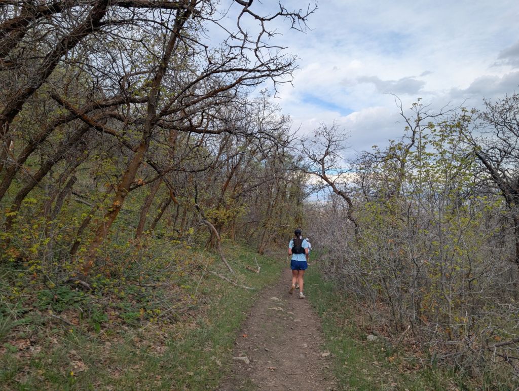 It started to blow hail as I followed this lady slowly running up the 4-5% grade of single track. It was slow but I was proud of myself for running it instead of walking! Two other very strong looking ladies in tank tops were right behind me. I just kept my head down to keep the hail from hitting me in the eyes and at this point just decided to move to keep warm. I have no idea how those other ladies were warm enough, I was absolutely freezing. But at least I wasn’t the only one silly enough to leave without a rain jacket! By the time we got back to Pole Canyon the sun came out and I was so thankful. All of us ladies caught up to each other and I think we all knew that this would be the podium. I tried not to think about that and just focus on my six hour goal, having a good attitude, and running what I could. At the last aid station I filled up my flask and left as fast as I could because I was barely going to hit the 6 hour mark with a 12 minute pace at this point and I knew we had a little bit of climbing left on the power line road.